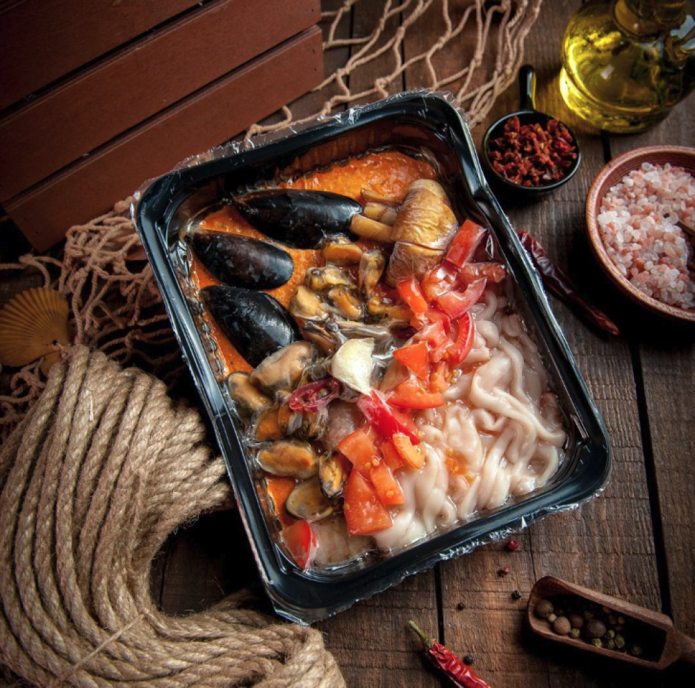 Кокосовое молоко, куриный бульон, паста Том Ям , креветка, мясо мидии, мидии на раковине, кальмар, шампиньоны, помидор, лист лайм, лемонграсс , кинза, чеснок, перец красный Чили, корень имбиря, соевый соус, лимонная кислота.
