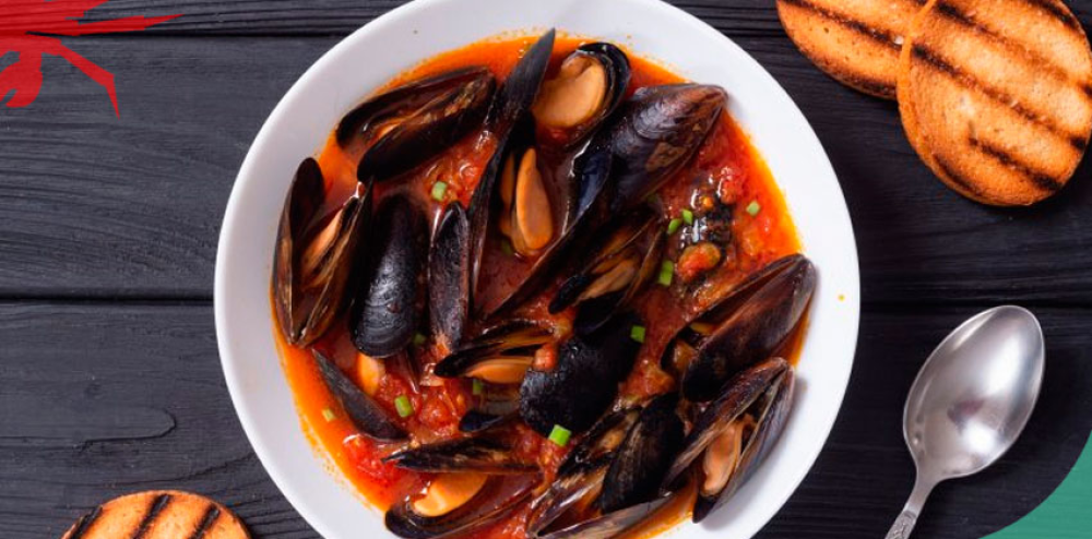 Мясо мидии в раковине,томатно-чесночный соус,лук,базилик,лавровый лист, чеснок, паприка, орегано,,томаты, белое вино, , подсолнечное масло, сахар,