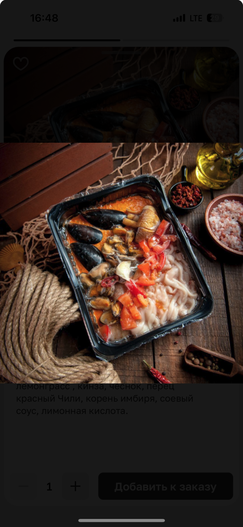 Кокосовое молоко, куриный бульон, паста Том Ям , креветка, мясо мидии, мидии на раковине, кальмар, шампиньоны, помидор, лист лайм, лемонграсс , кинза, чеснок, перец красный Чили, корень имбиря, соевый соус, лимонная кислота.