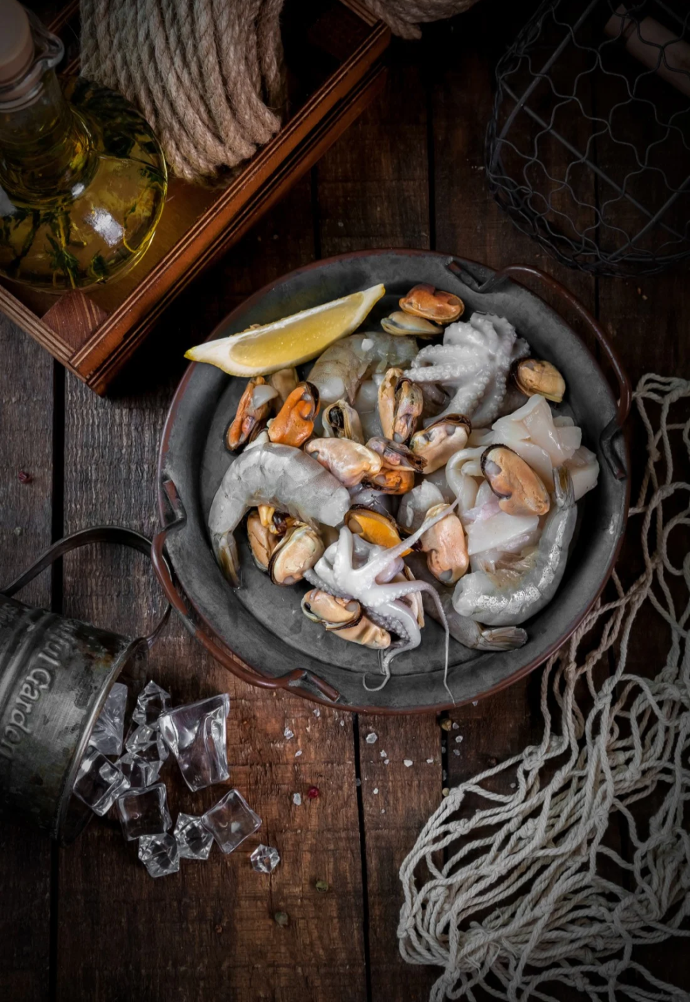 филе мидии Чили, креветки коктейльные чищенные, осьминог резаный, филе и щупальца кальмара