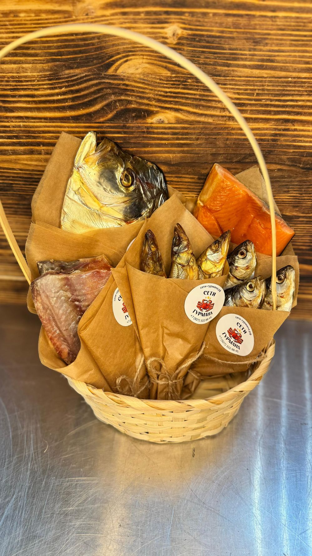Наполнение: Вомер х/к, горбуша филе х/к насечка, вобла тушка вяленая 2 шт , корюшка хк 3 шт, пелядь вяленая 3 шт. Цена набора с оформлением в корзине от 1700₽